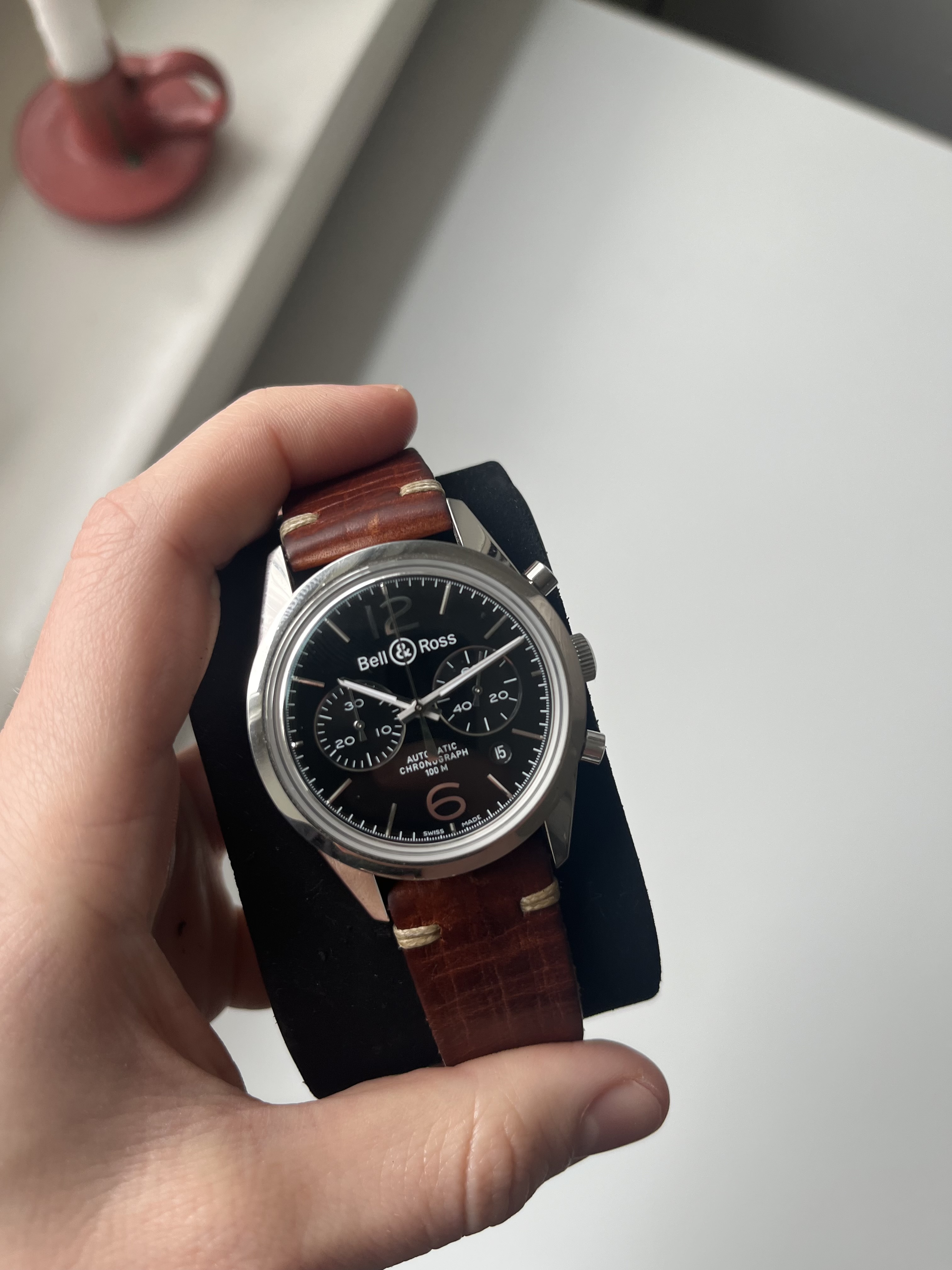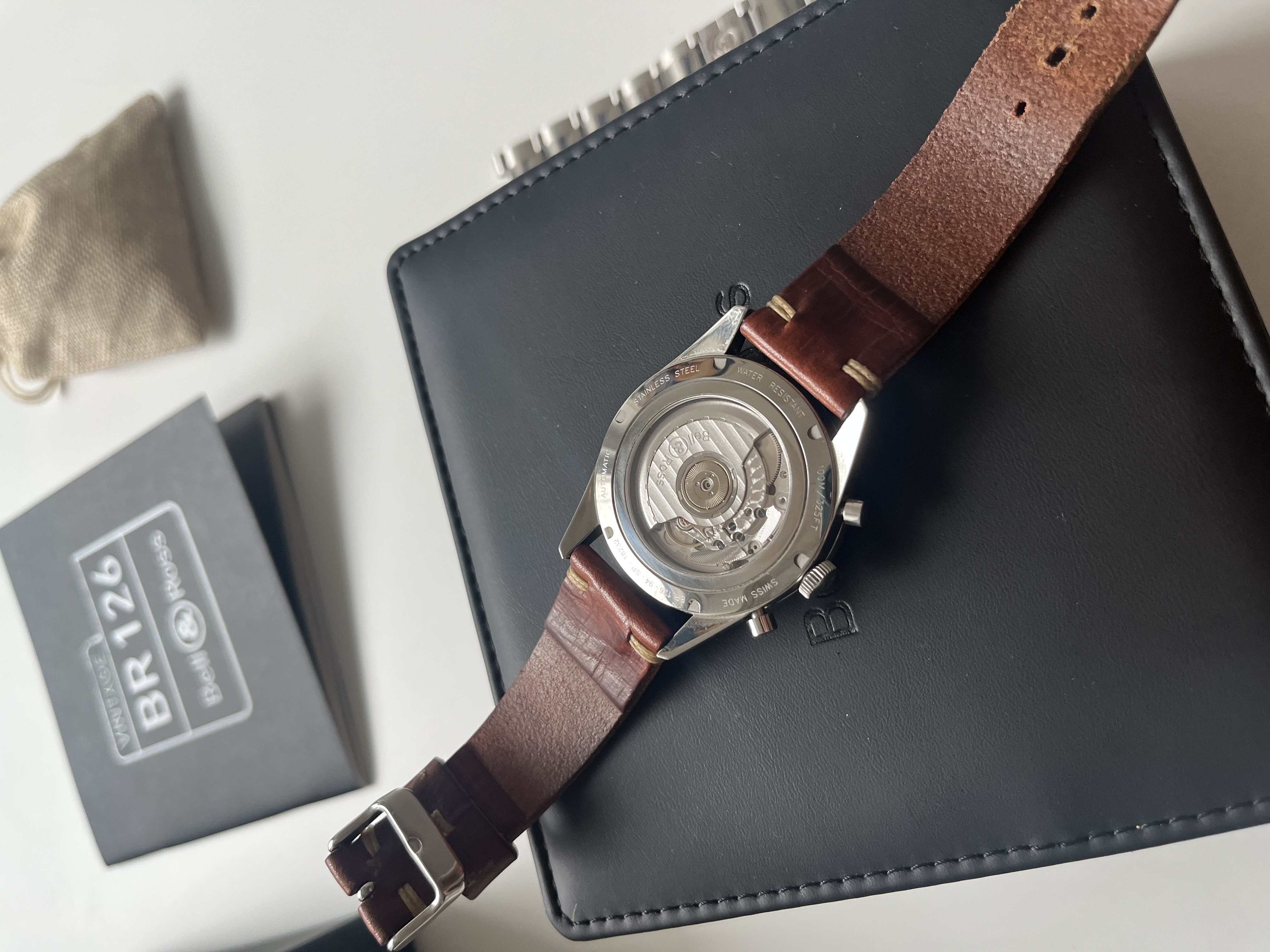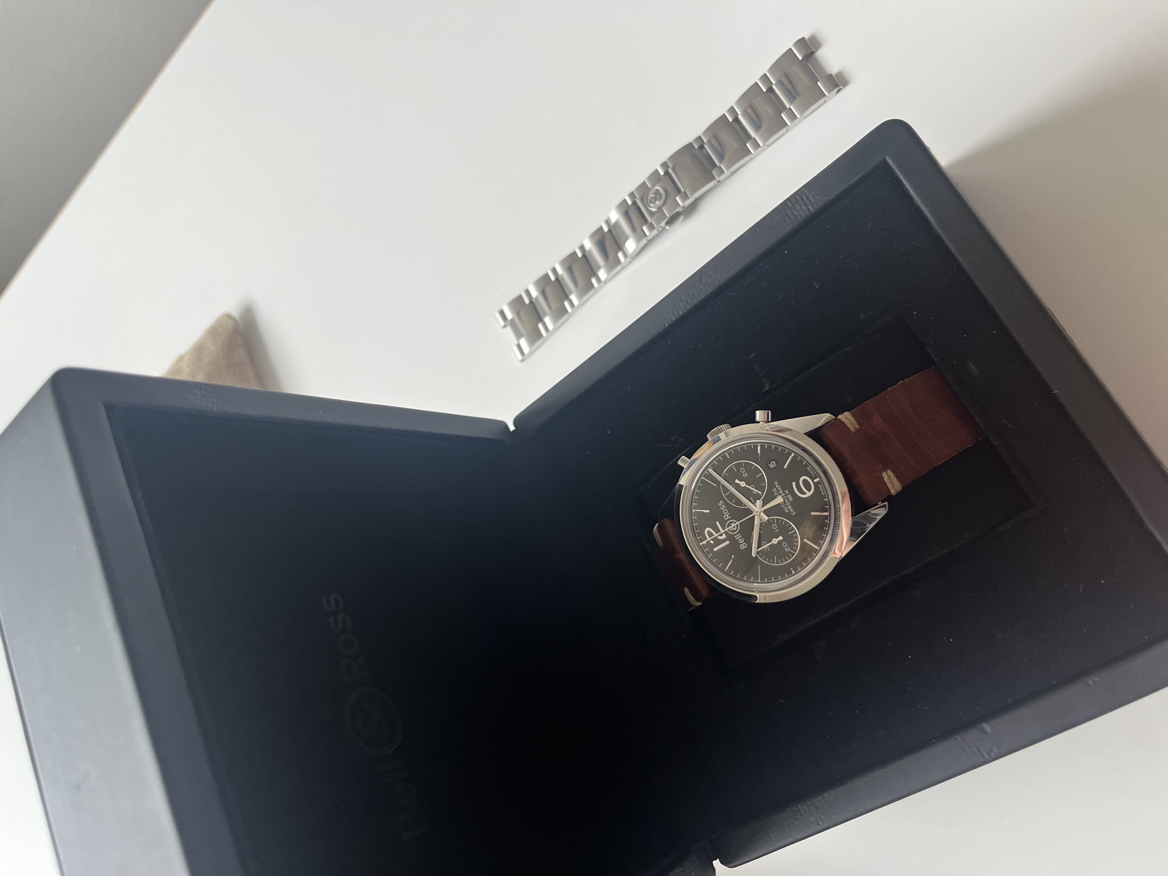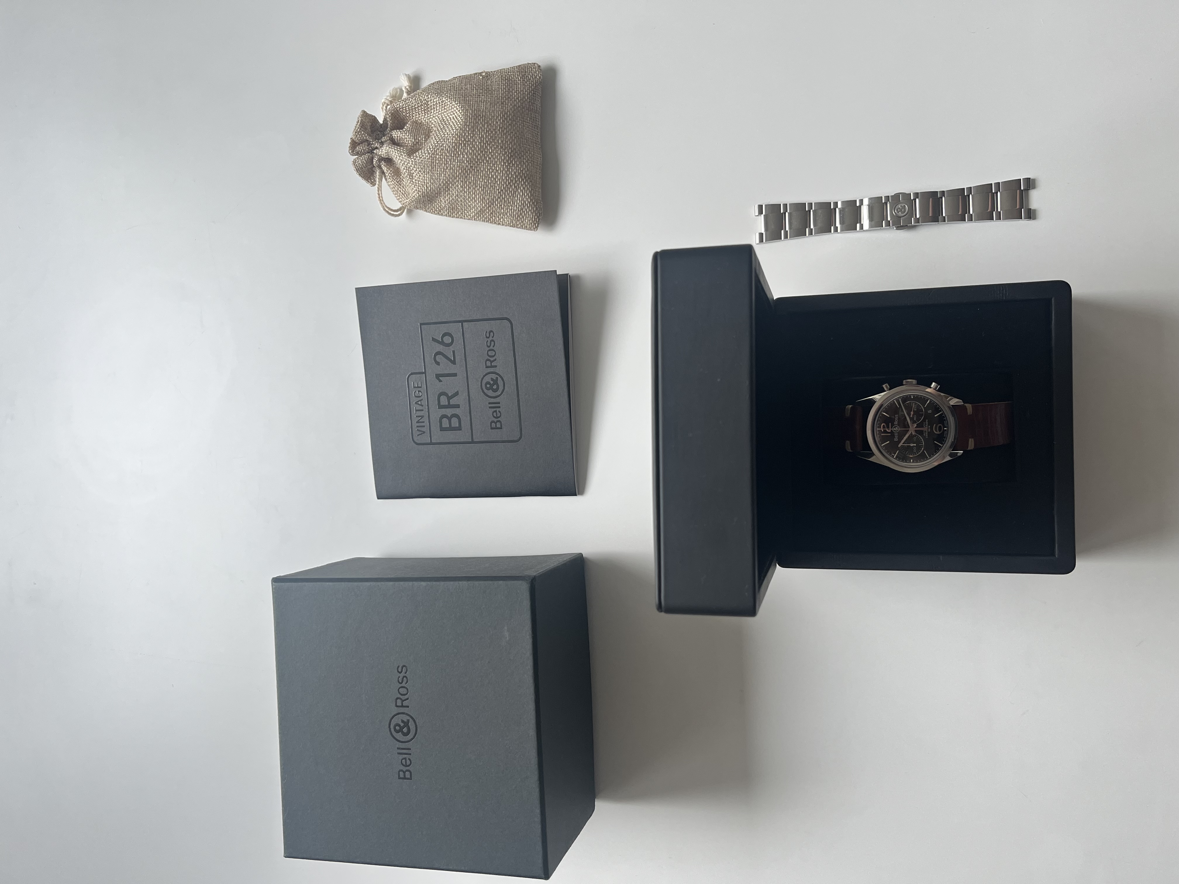 Fullset Bell & Ross BR 126 Officer Black kronografi Vintage-mallistosta. Siisti käytetty kunto. Mukaan finwatchstrapsin nahkaranneke (ovh. n. 150 euroa) ja iskemätön BR:n oma metalliranneke. Ei tiedossa olevaa huoltotarvetta