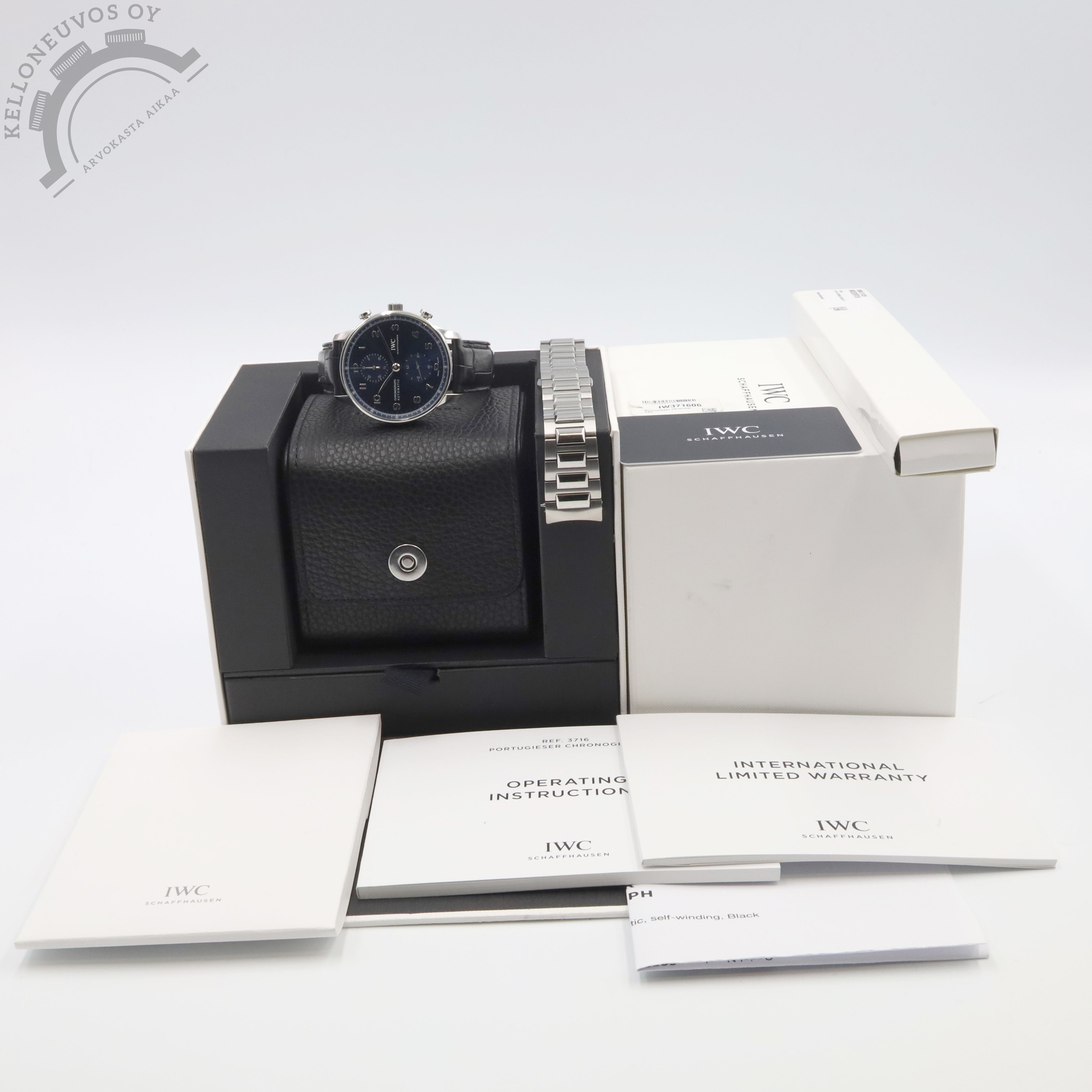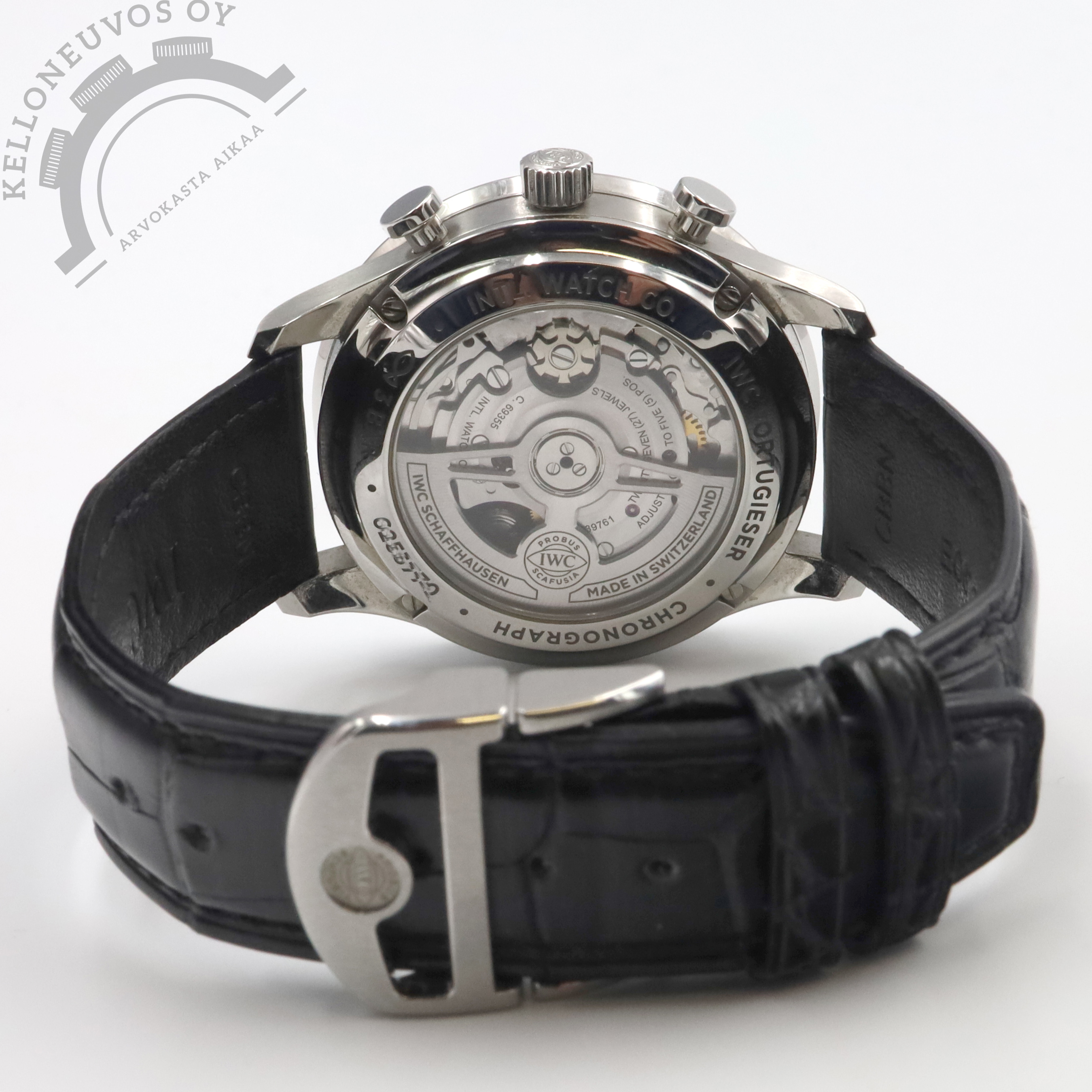 Tarjolle huippukunnossa oleva, klassisen tyylikäs Portugieser Chronograph. Erittäin näyttävällä sinisellä taululla josta löytyy ajanotto, pikkusekunnit sekä tyylikkäät osoittimet ja indeksit. Teräksinen kuori kiillotetulla kehällä. Rannekkeina kuvissa kiinni oleva alkuperäinen musta alligaattorin nahkaranneke omalla perhoslukolla. Lisäksi mukaan tulee kelloon loistavasti istuva erikseen ostettu mallin oma teräsranneke jonka arvo noin 1500e. Safiirilasi suojaa kellon etupuolta ja niinikään safiirisen takakannen alla tikkaa erittäin tarkoin käyntiarvoin IWC 69355 -automaatti jolle luvataan 46h käyntivara. Full set, kellon takuukortti on päivätty 3/2022. Kellon ovh. 9 600e + erikseen ostettu teräsranneke.