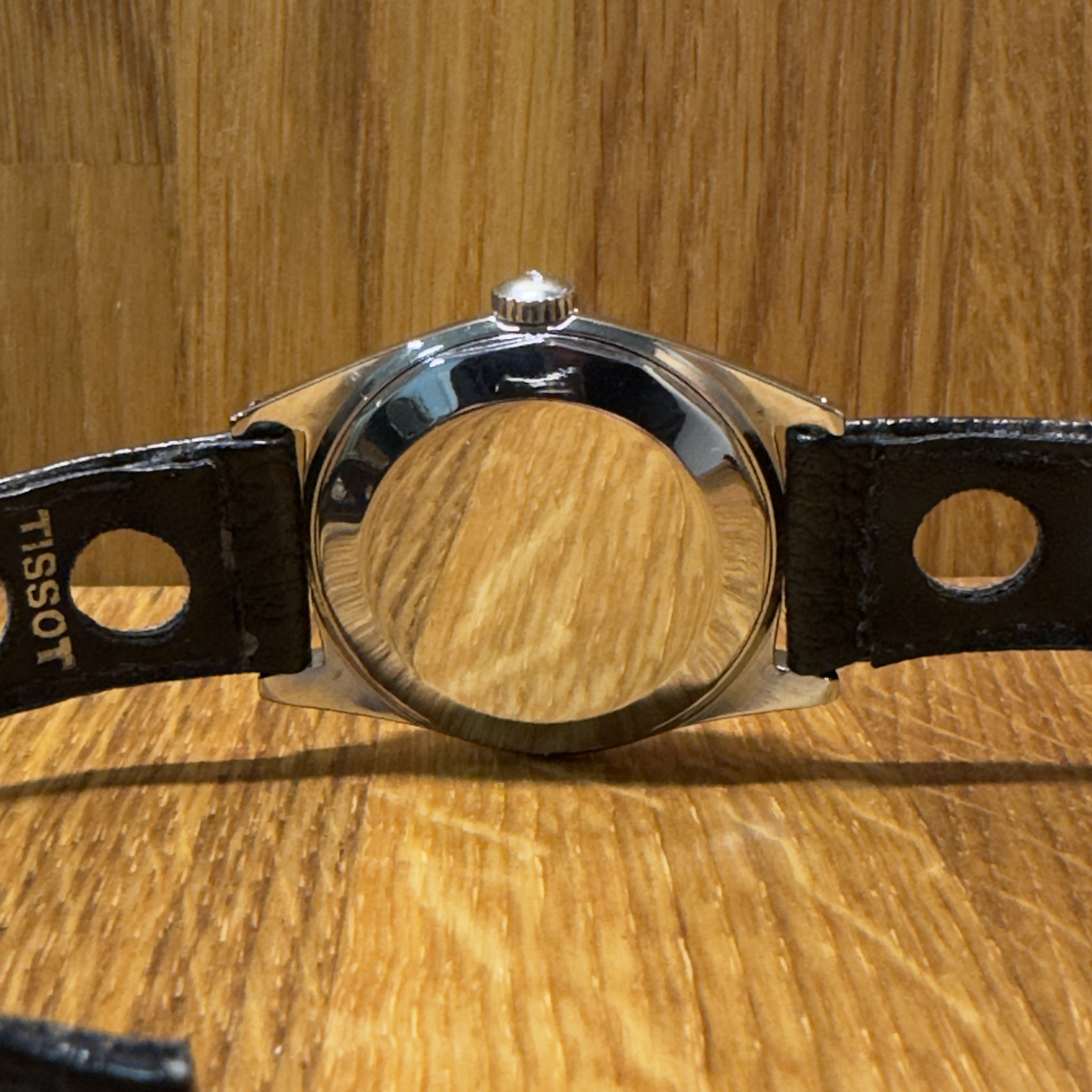 Teräskuorinen automaattikello. Kellossa on alkuperäinen nuppi ja alkuperäinen musta Tissot-nahkaranneke (käytetty) ja solki. Kello on huollettu ja sille myönnetään 24kk takuu.
