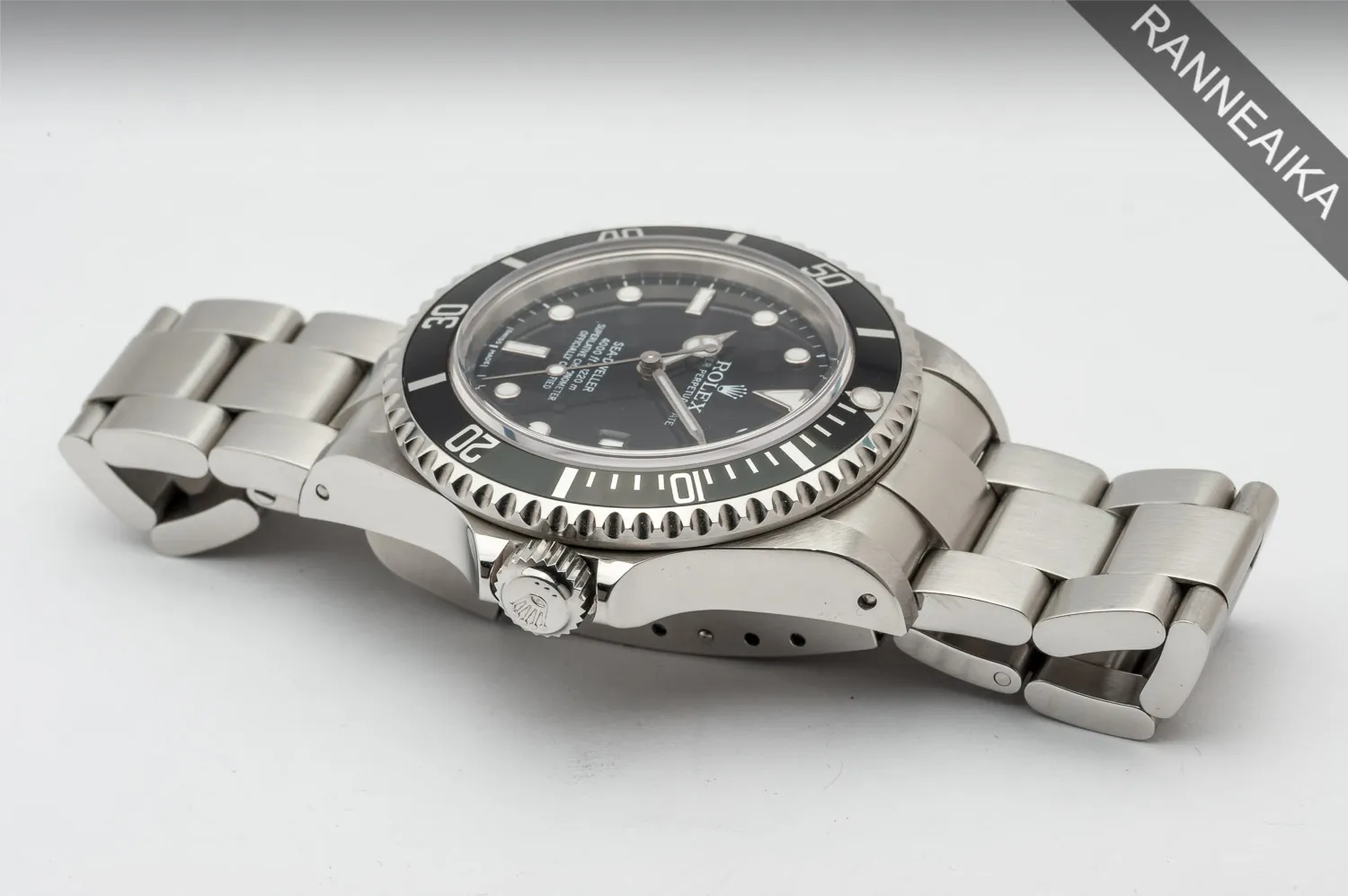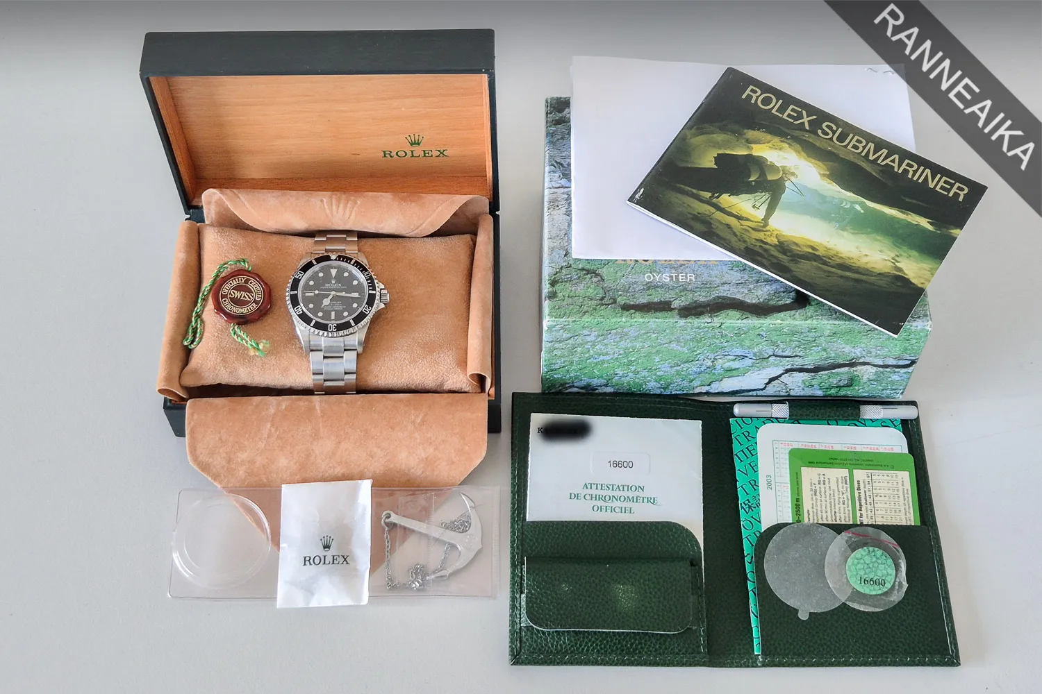 Huippukuntoinen ja erittäin haluttu sukeltajankello, jossa on mukavasti preensensiä sen sisarmallejaan paksumman kuoren ansiosta. Aiemmasta 16660 (“tripple six”) -mallista poiketen tässä peltikehäisessä diverissa on mukana tuulahdus uudempaa teknologia, kuten taulun luminova-lumeaine, teräksiset rannekkeen päätypalat (nk. SEL, eli “solid end link” -ranneke) sekä uudempi cal. 3135-koneisto. Musta, selkeälukuinen taulu tälle mallisarjalle tyypillisesti ilman päivyrin suurennuslasia. Teräksisen kuoren sisällä tikittää tarkasti Rolexin inhouse-automaattikaliiperi. Kellon paperit on päivätty 10/2002 ja se on huollettu 10/2024 – huoltotakuu on voimassa 10/2025 asti. Mukaan kaikki alkuperäiset paperit, korttitasku, hang tag, molemmat laatikot, bezelin muovisuoja, ranneketyökalu sekä näyttävä ankkuriavaimenperä. Tästä upea keräilytason setin omaava diver, jolla uskaltaa sukeltaa hieman syvemmissäkin vesissä!