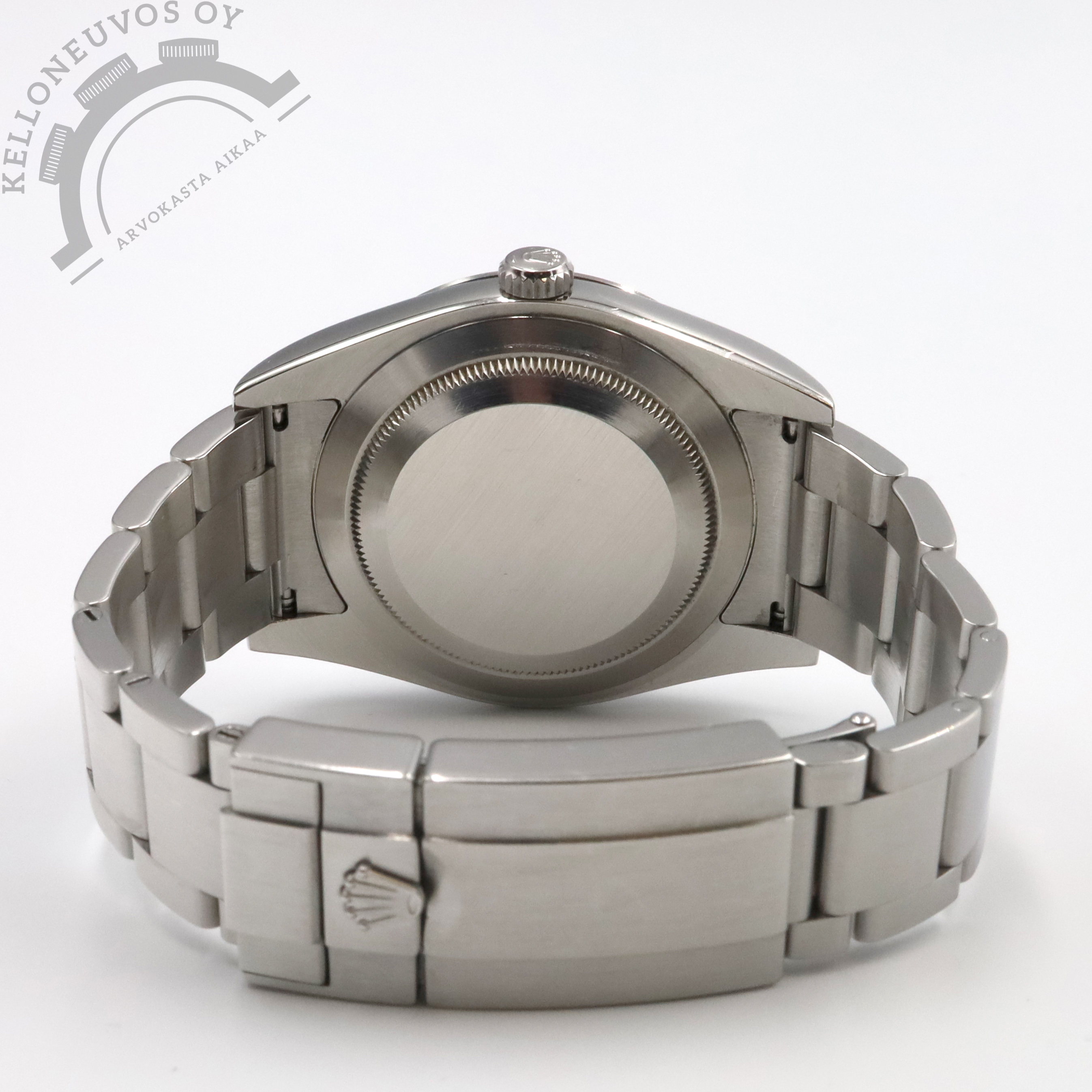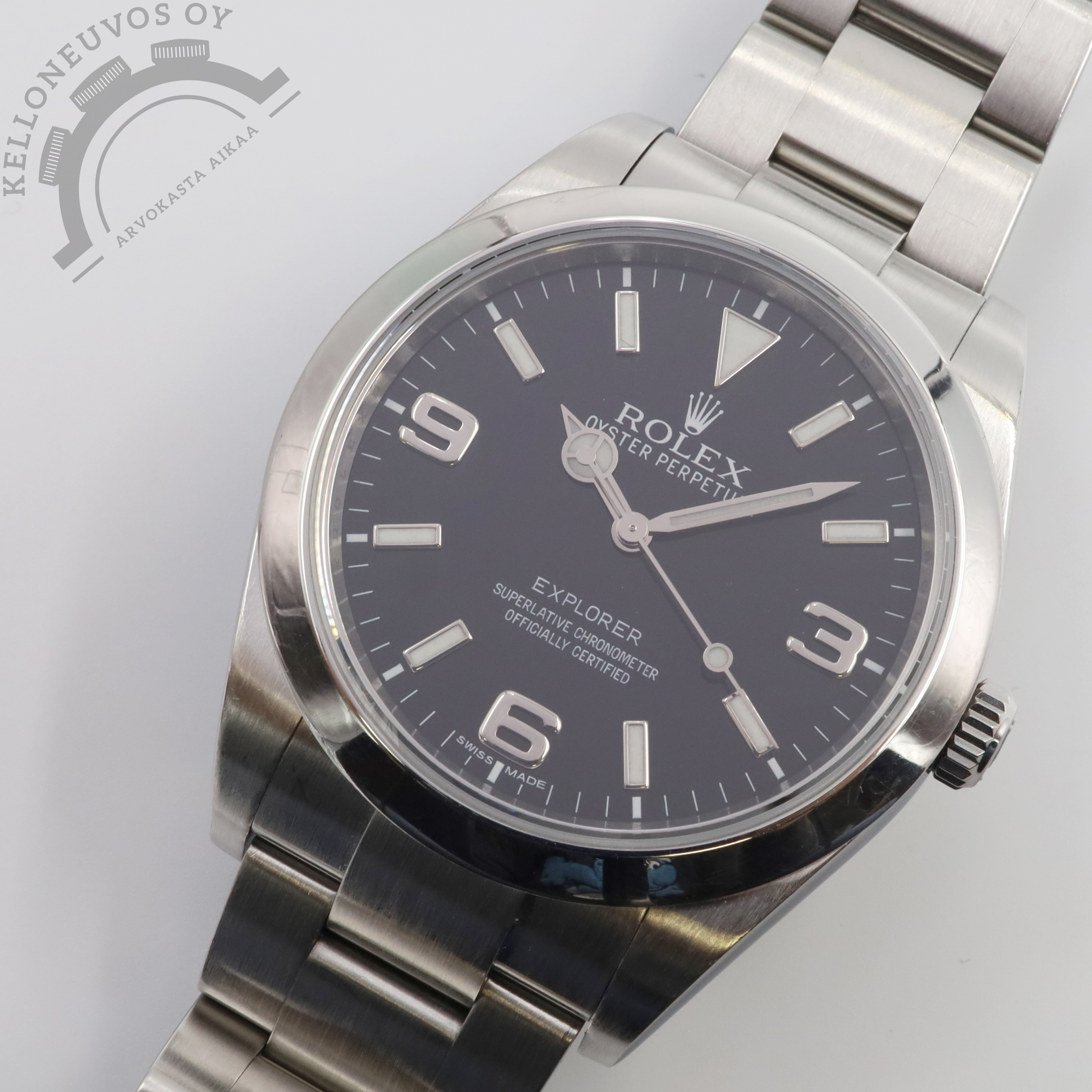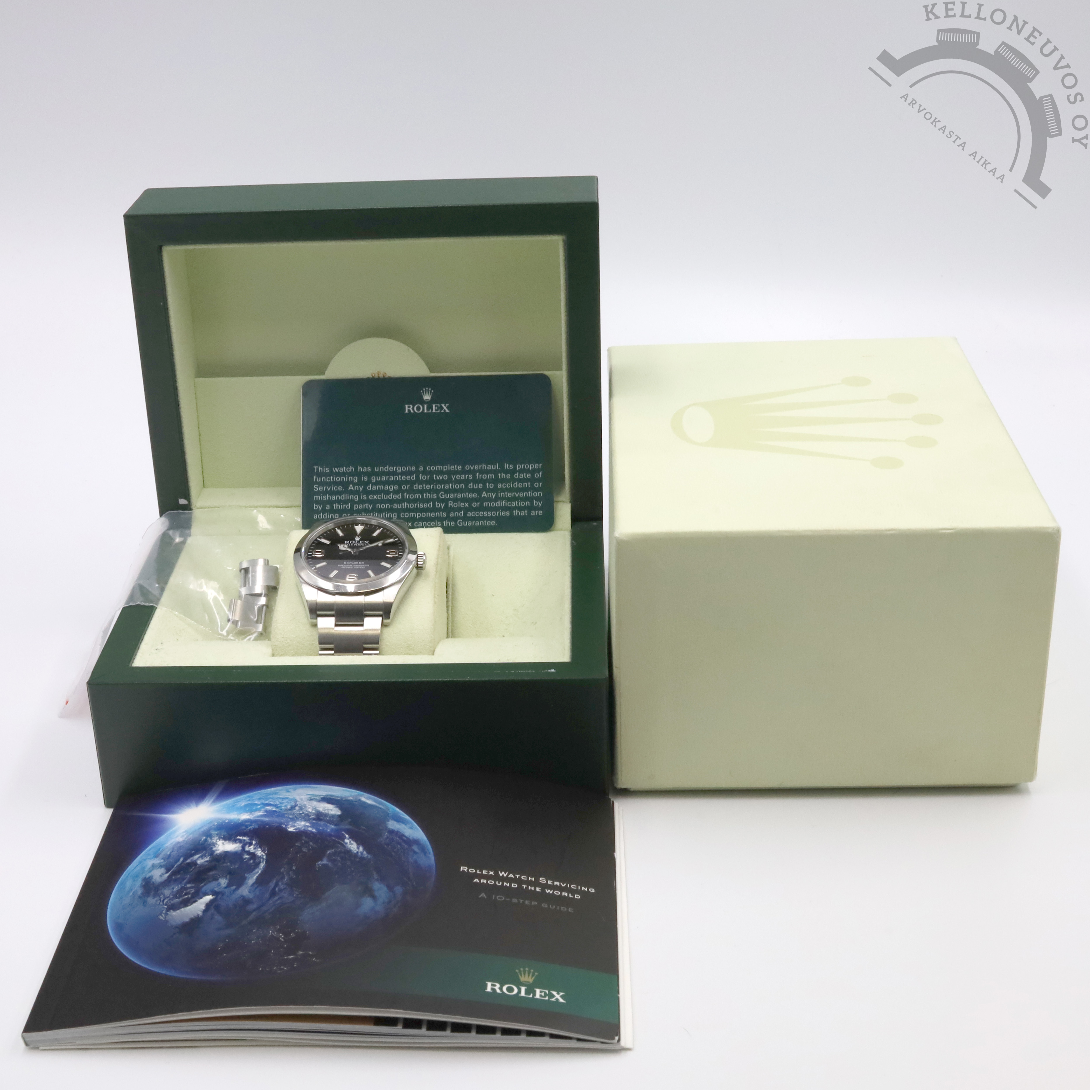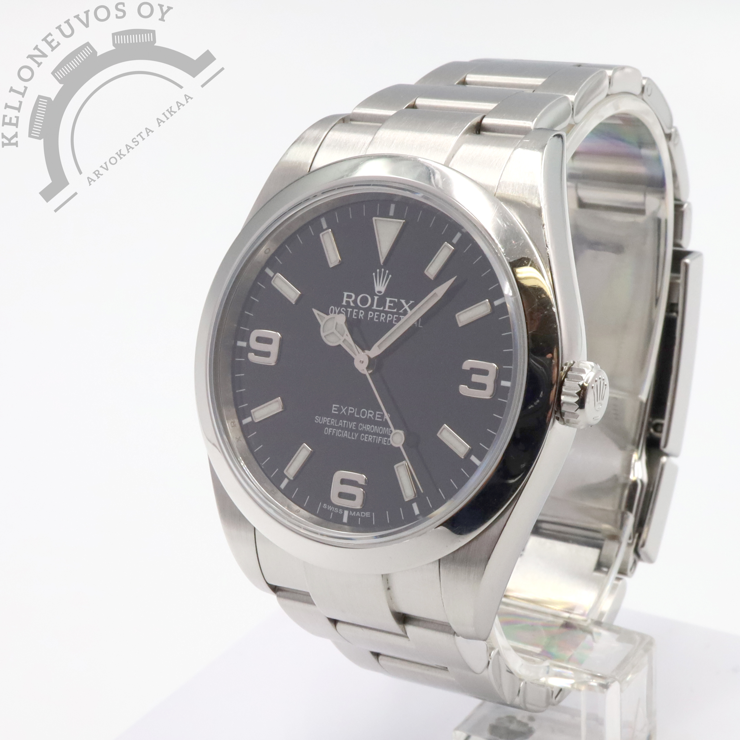 Tarjolle upea Rolex Explorer I Mark I. Erittäin selkeälukuisella mustalla taululla jossa ei mitään ylimääräistä. Teräksinen kuori sekä täyspitkä teräsranneke. Koneistona toimii loistavin käyntiarvoin tikkaava Rolex 3132- automaattikaliiperi jossa 48h käyntivara. G-sarjaa eli vuodelta 2010 ja se on RSC-huollettu 3/2022. Jonkin verran käytöstä tullutta kulumaa havaittavissa.