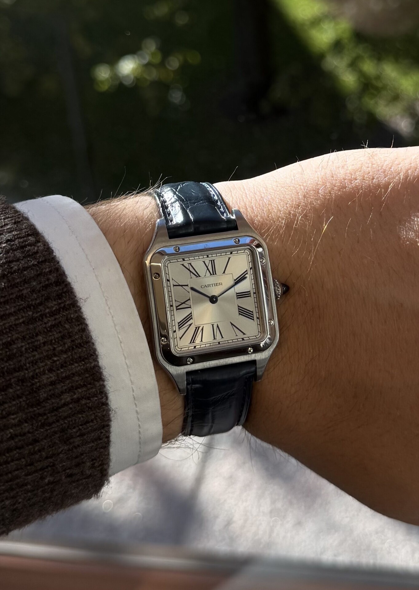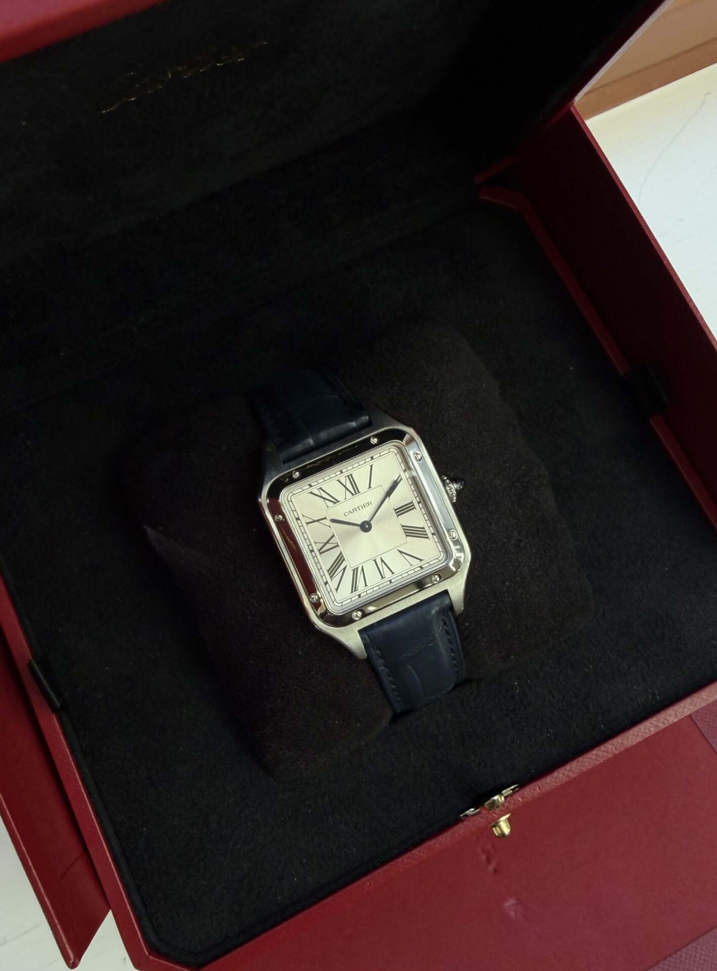 Erinomaisessa kunnossa oleva Cartier Santos-Dumont Large (10/2022). Cartier Santos-Dumont on ikoni, jonka juuret ulottuvat vuoteen 1904, kun Louis Cartier suunnitteli kellon lentäjäystävälleen Alberto Santos-Dumontille. Large-kokoinen kuori, roomalaiset numerot ja tyylikkäät viisarit tekevät mallista ajattoman ja arvostetun. Vuosimalli: 10/2022 Halkaisija: 43.5 mm x 31.4 mm Koneisto: Kvartsi Kellon mukana: Laatikot, takuukortti, manuaalit Takuu: Valmistajan takuu voimassa 10/2030 saakka