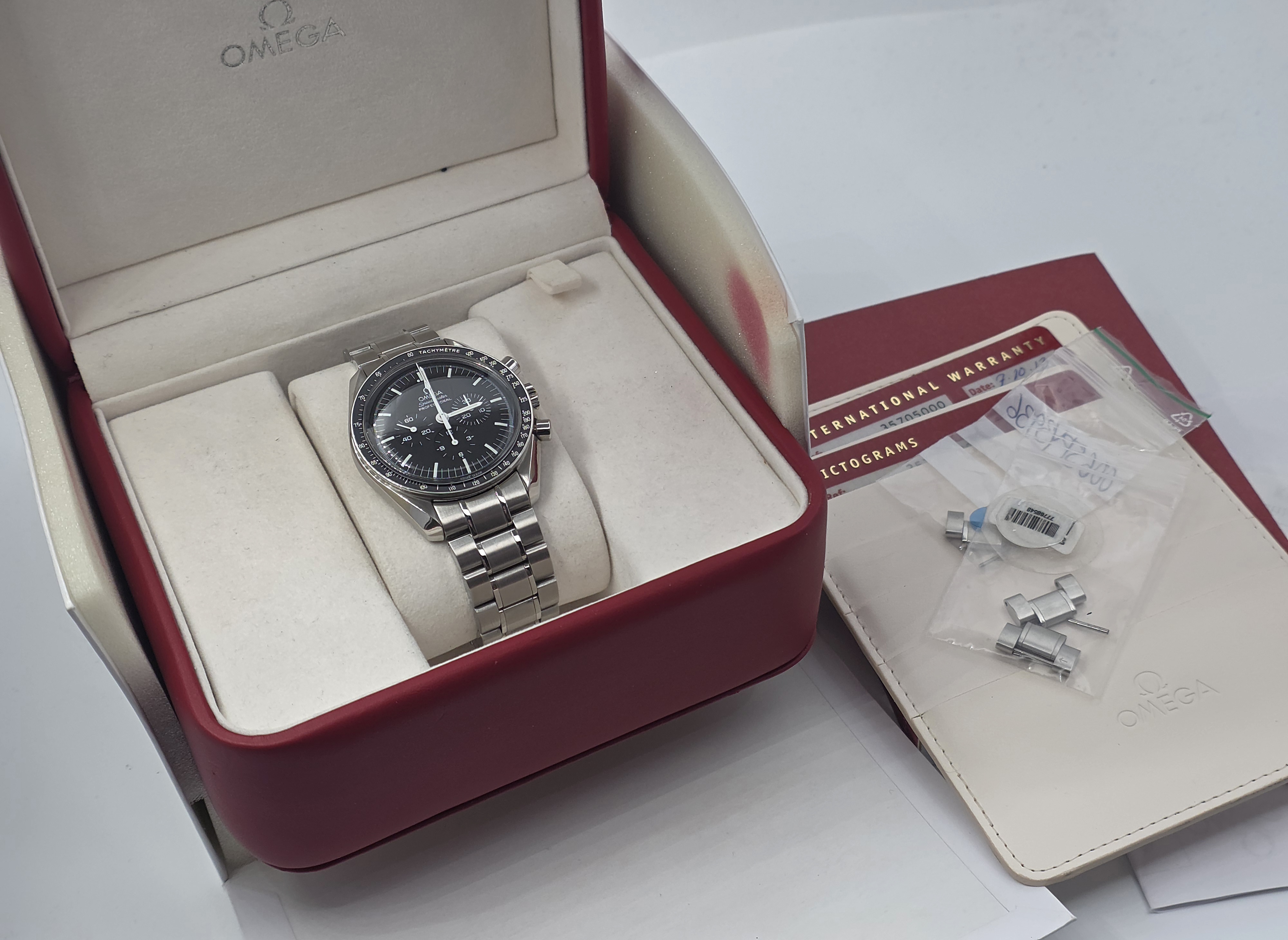 Legendaarinen Omega Speedmaster Professional "Moonwatch". Ostettu uutena 10/2013 (Suominen, Turku). Kellon mukana täysi setti ja huoltotosite (07/2021). Siistissä kunnossa. Tästä edullisesti yksi kellomaailman ikonisimmista malleista!