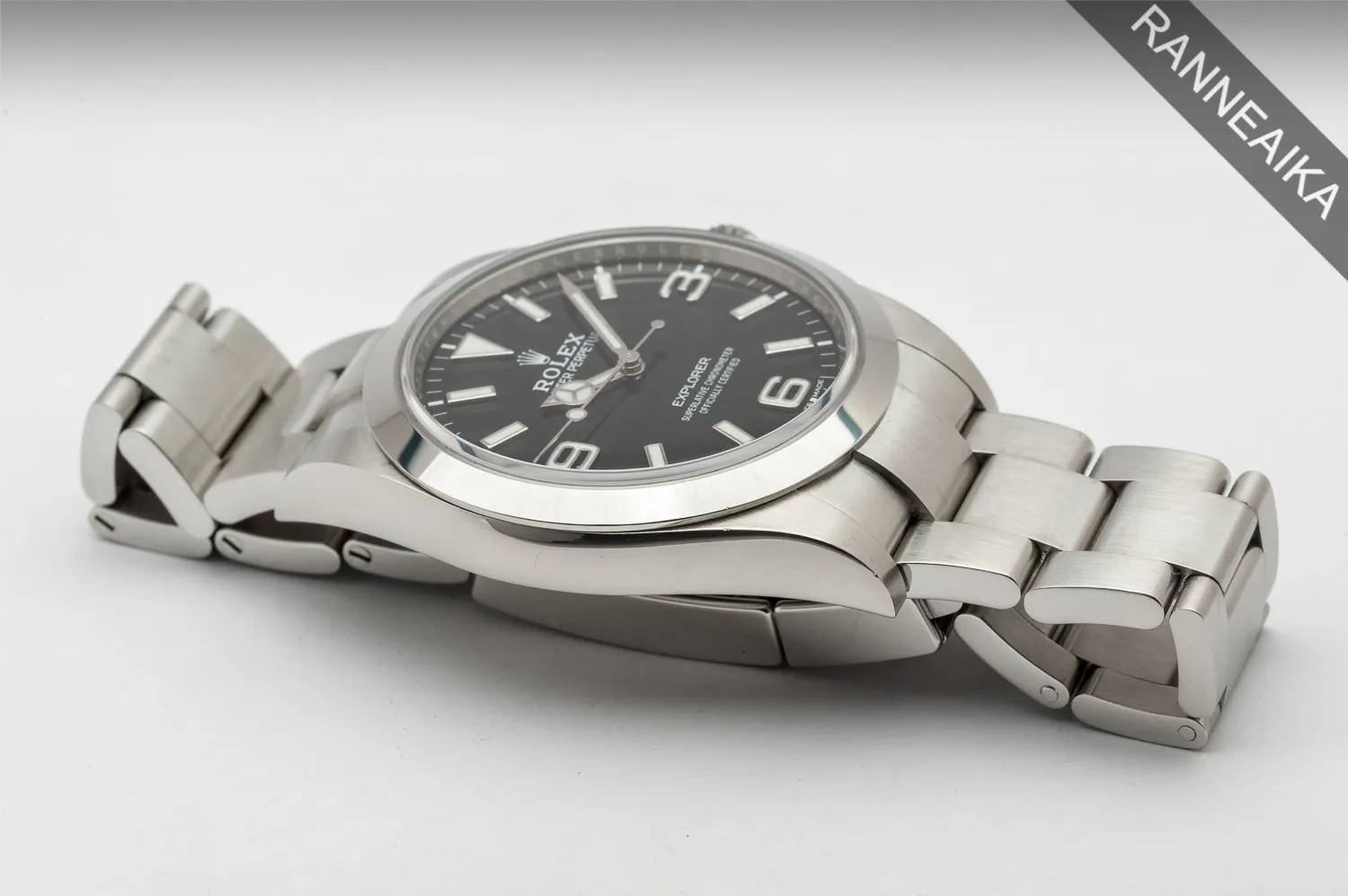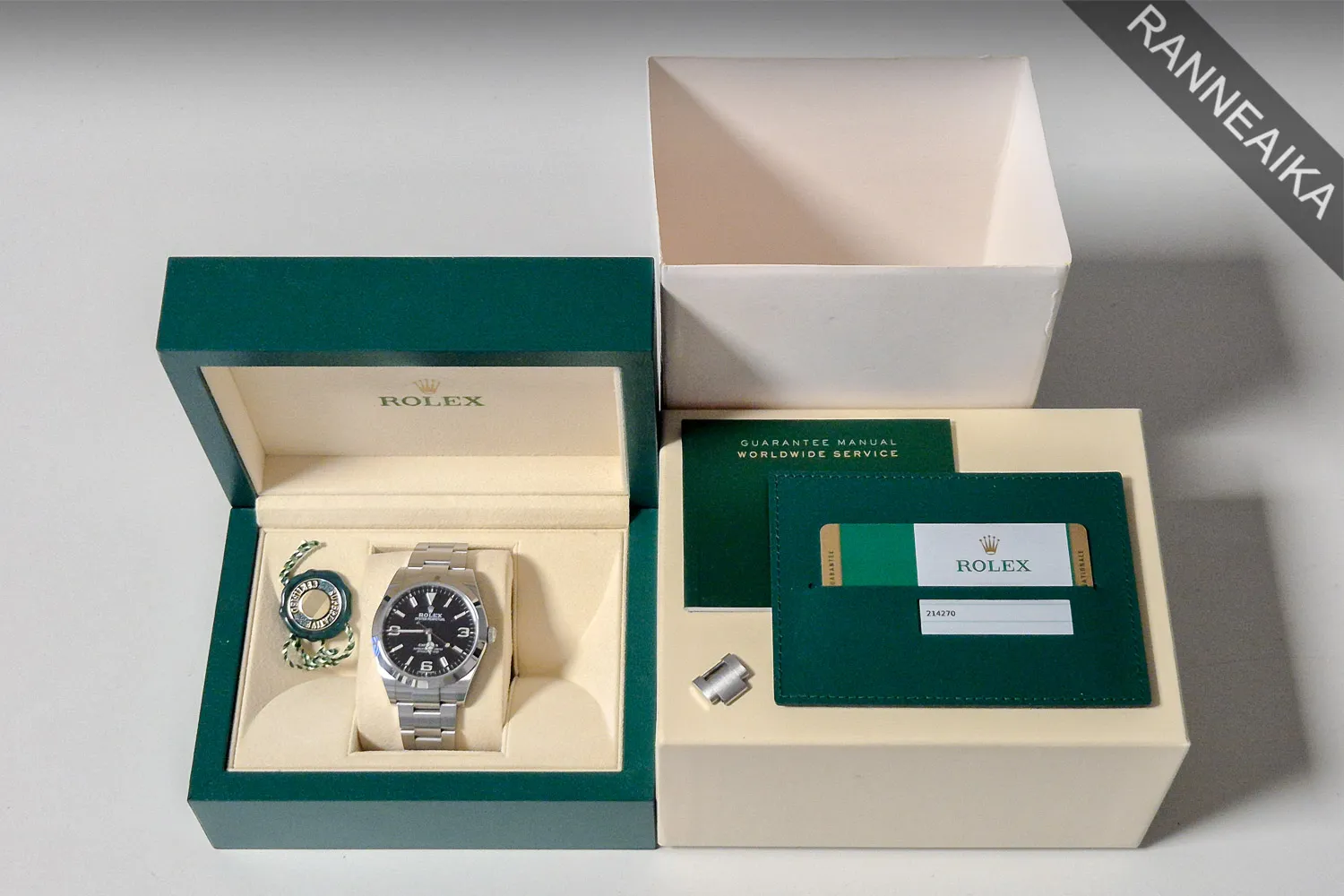 Elegantti, jo tuotannosta poistunut 39mm Explorer joka on erinomainen valinta niin arkeen kuin juhlaankin. Todella monipuolinen kello, johon käy erinomaisesti myös erilaiset nahka- ja tekstiilirannekkeet. Teräskuori ja -ranneke, niin ikään teräksisen takakannen suojassa tikittää tarkasti Rolex 3132 -automaattikaliiperi. Tämä tuotannon loppupään yksilö on varustettu halutulla MK2-taululla, jossa 3/6/9 indeksit sekä myös osoittimet ovat luminoitu. Kellon paperit on päivätty 06/2019 ja se käy erinomaisesti. Mukaan alkuperäinen takuukortti, takuuopas, korttitasku, hang tag sekä molemmat laatikot + kartonkinen suojahiha. Tästä todella haluttu keräilytason Explorer!