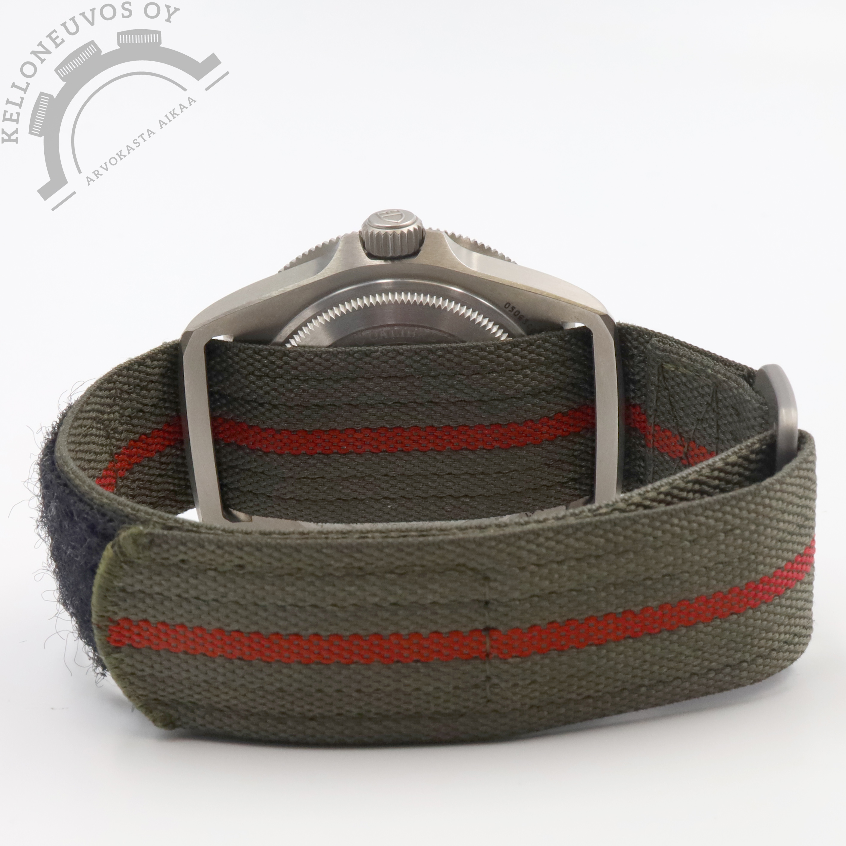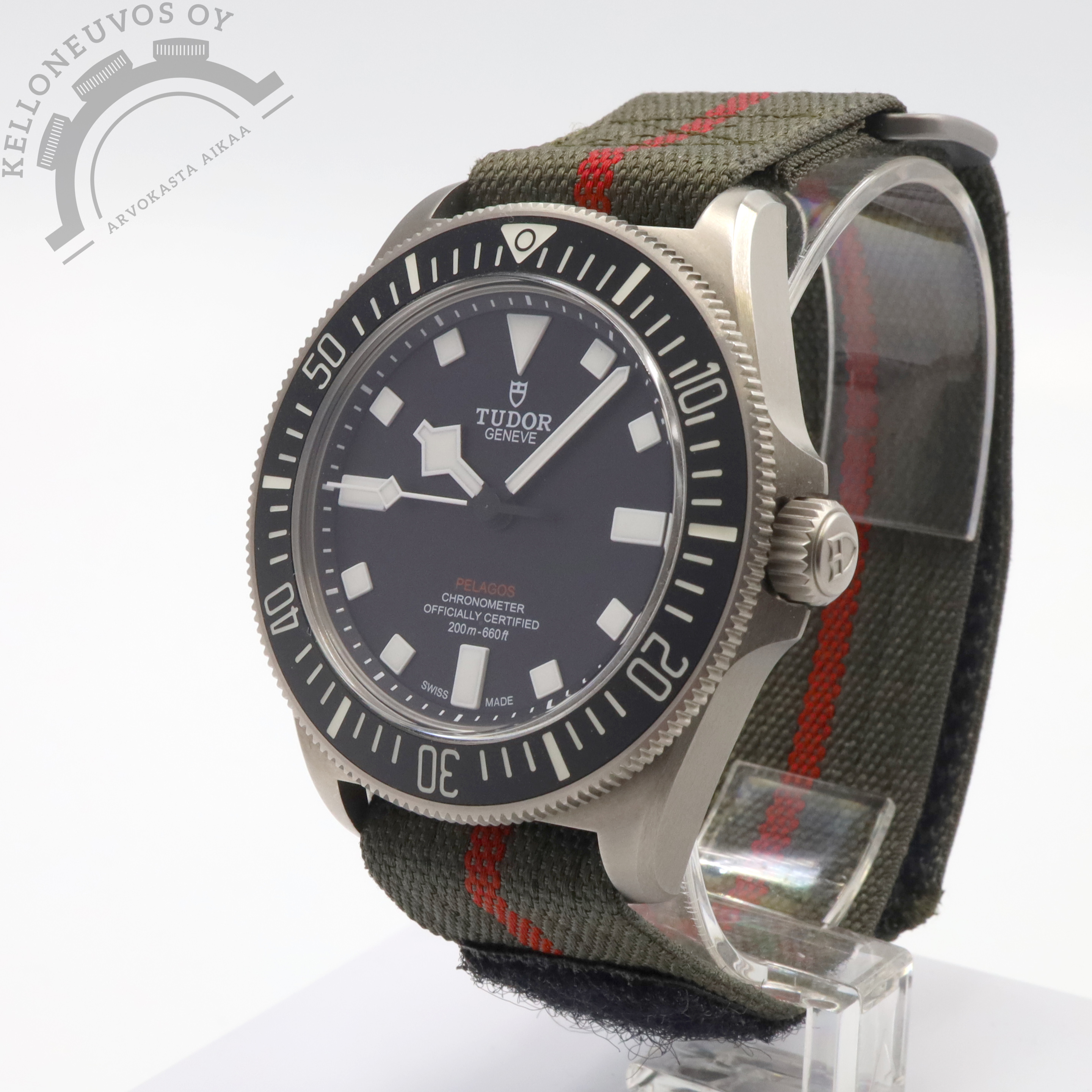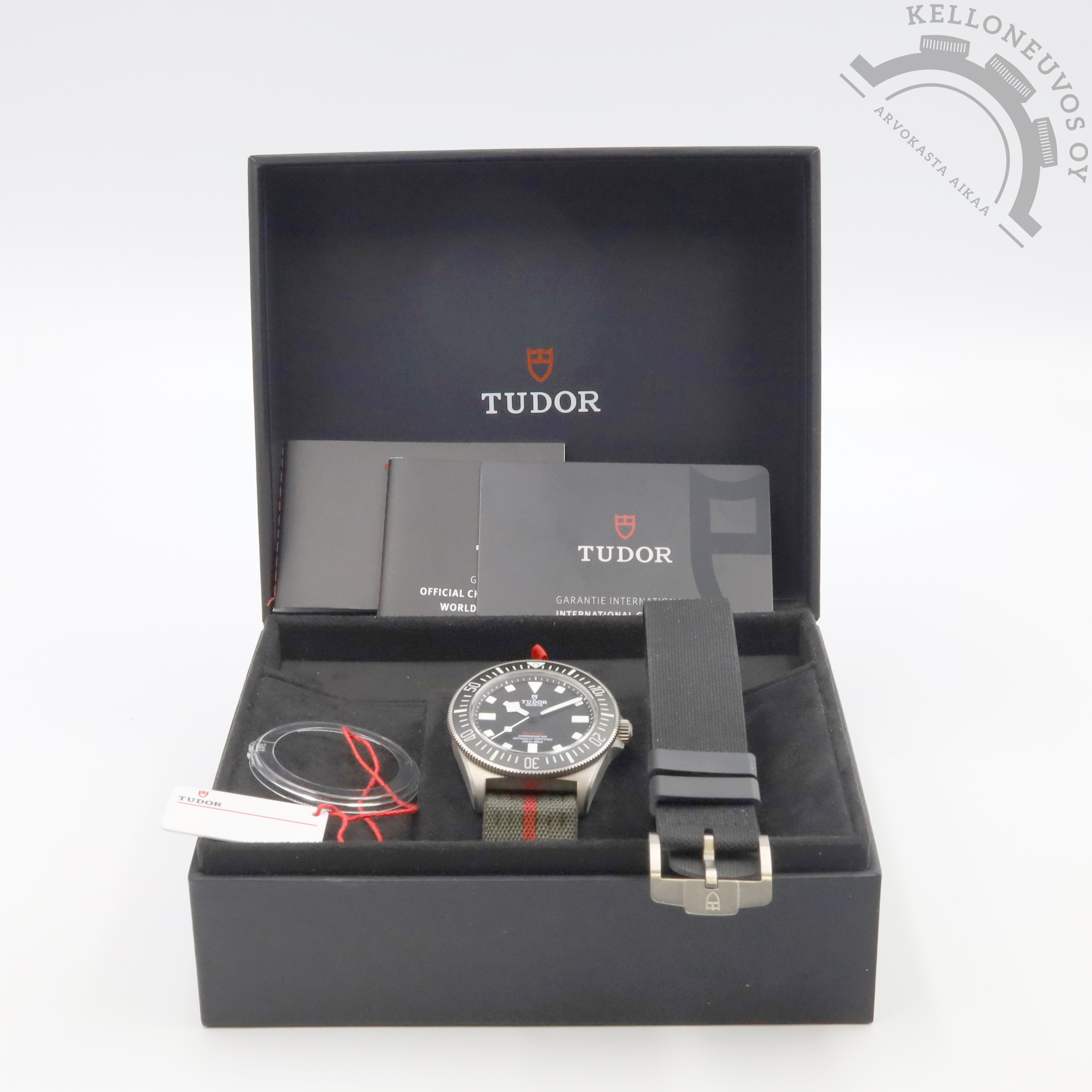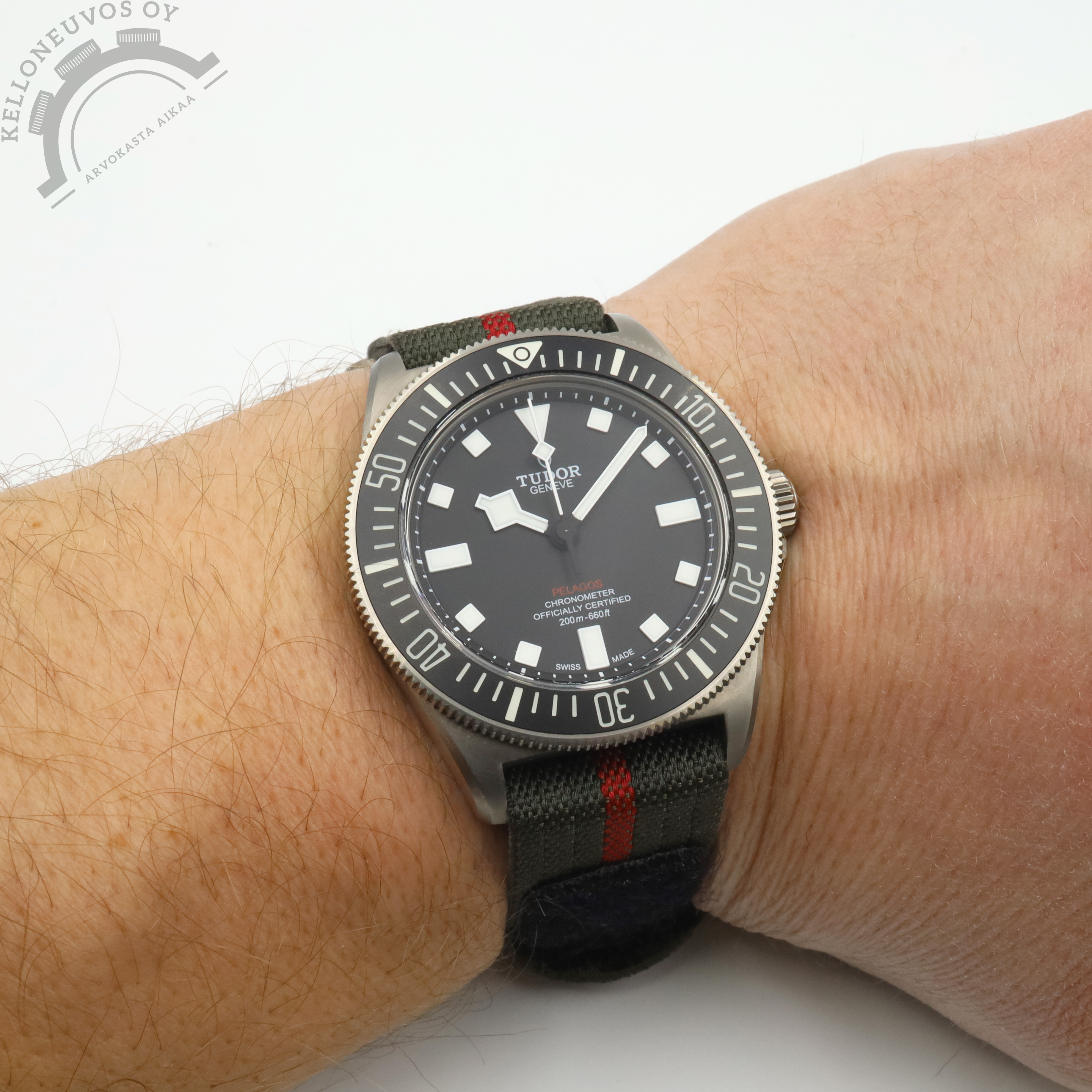 Tarjolle haluttu sekä täysin uudenveroisessa kunnossa oleva Tudor Pelagos FXD. Selkeälukuisella mustalla taululla, mustalla keraamisella kehällä sekä titaanisella kuorella. Mallissa ei ole perinteisiä jousinastoja vaan rannekkeet tulee kiinni kiinteiden korvakkeiden väliin, rannekkeina kuvissa näkyvät Robustin tekstiilinato sekä hyvin taipuisa kumi omalla soljella. Koneistona toimii Tudorin MT5602- automaattikaliiperi jossa 70h käyntivara. Kelloa seuraa laatikko, manuaalit, hang tag, bezelin suoja, musta nahka omalla soljella sekä takuukortti. Kellon takuukortti on päivätty 10/2023.